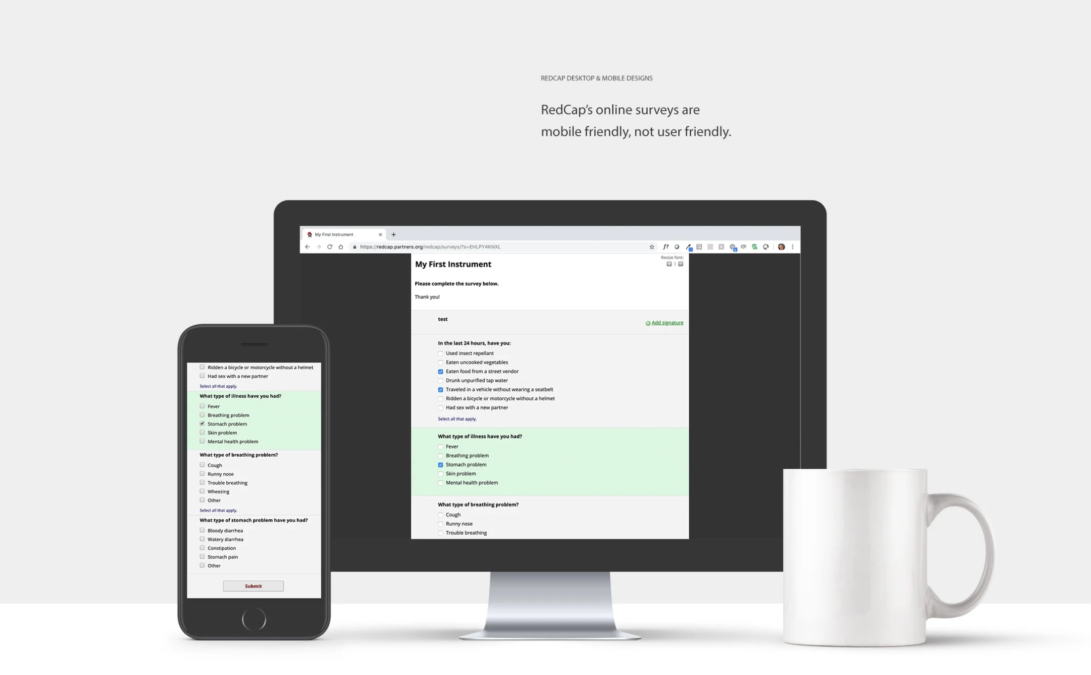 Although mobile surveys are easier to access, users might encounter barriers in completing a survey through study designs that do not consider the mobile use experience. I advocated for shorter studies with less texts, larger font sizes, button sizes that fit standard UI guidelines and an easy-to-follow flow of question topics. Branding recognition via customizable interface designs would also allow for users to recognize the app with little hesitation and guesswork.